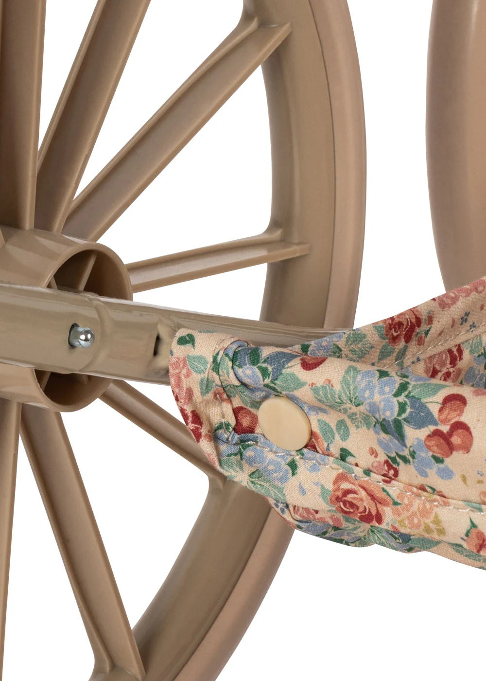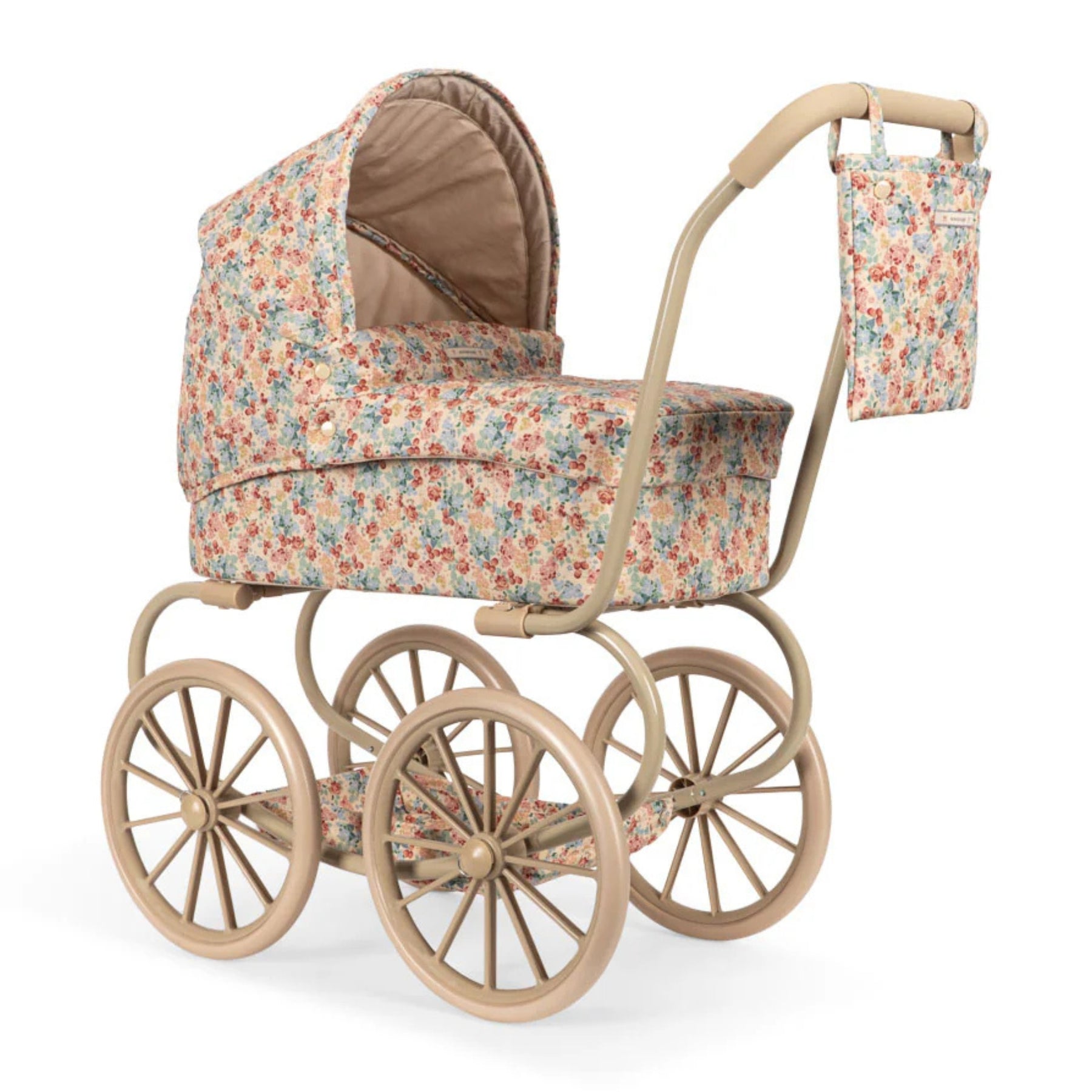 Dukkuvognur í vintage-stíli við fýra stórum hjólum, sum ger hann lættan og stabilan hjá smábørnum at ganga við. Vognurin er sniðgivin við kviltaðum fóðri, hevur eina mjúka madrassu og ein fóðraða vørukurv. Stellið er úr metalli og hevur mjúk handtøk.