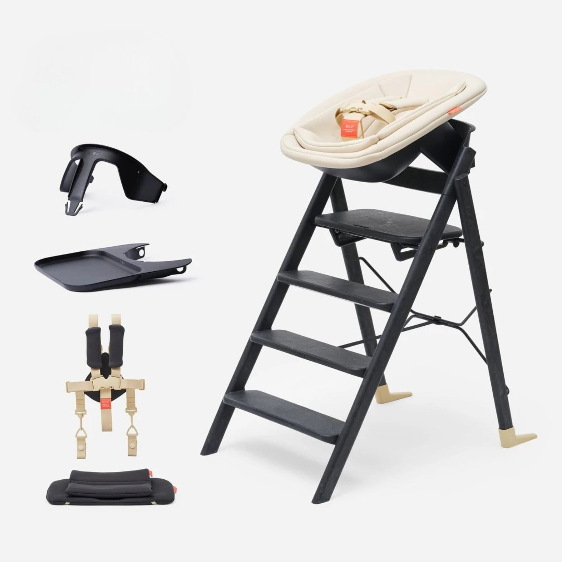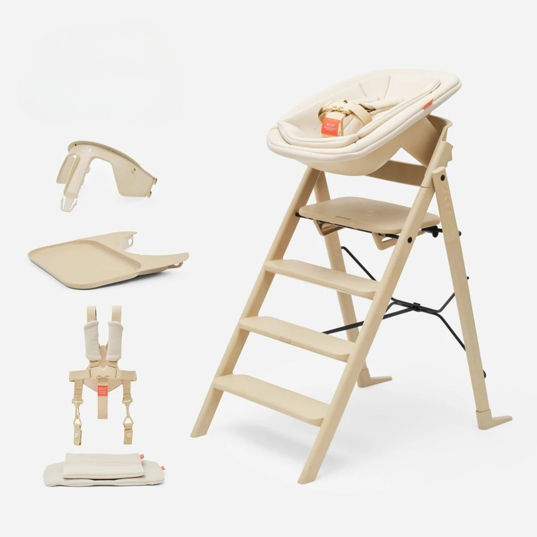 Pakkatilboð með Kaos Klapp matarstól, newborn-setti, bakka, borði, öryggisbeisli og sætispúða.
