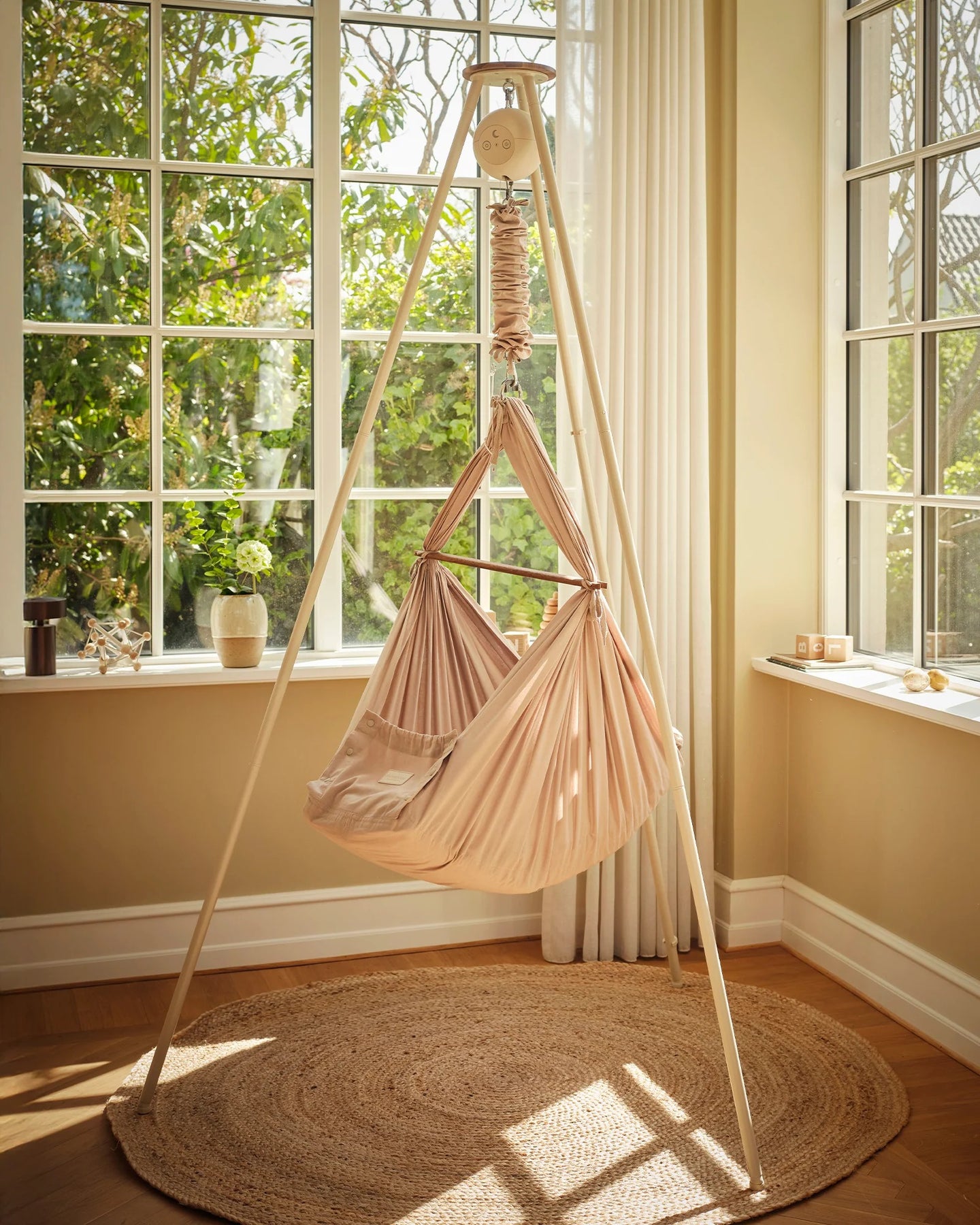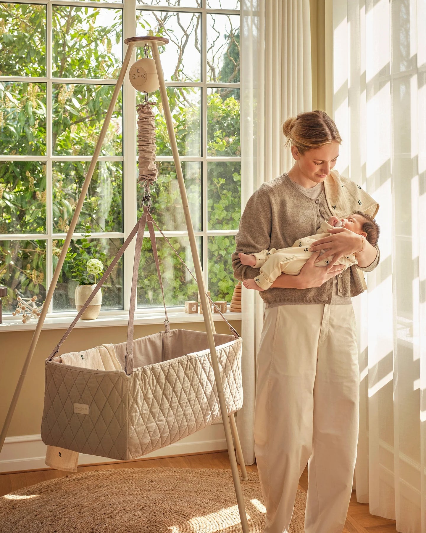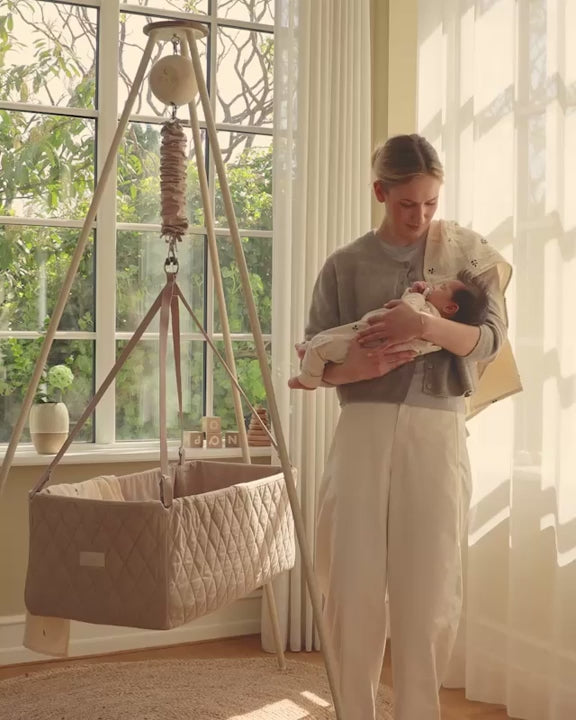 Stabilt og stílfult stativ, sum passar til bæði heingikoyggjuna og vøgguna frá Moonboon. Er lætt at seta saman og taka sundur aftur uttan amboð. Stendur væl við gummifótum, sum verja gólvið.
